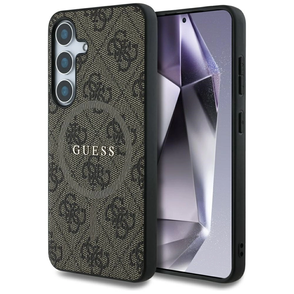 Etui Guess 4G Glitter Triangle Buttons MagSafe do Samsung Galaxy S25 brązowy