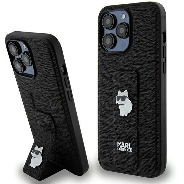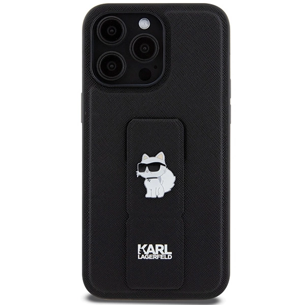Etui Karl Lagerfeld Gripstand Saffiano Choupette Pins na iPhone 13 Pro Max - czarne