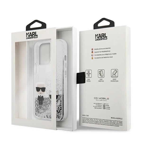 Etui Karl Lagerfeld Liquid Glitter Karl&Choupette na iPhone 13 Pro Max 6,7" - srebrne