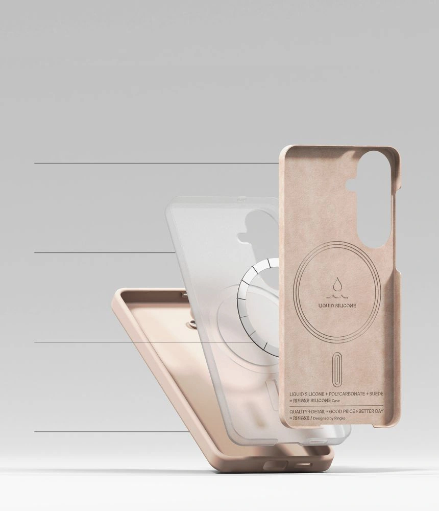 Ringke Silicone MagSafe to smukłe i wytrzymałe etui o hybrydowej konstrukcji. Trójwarstwowa struktura łączy miękką silikonową powłokę zewnętrzną z wzmacniającą ramką PC od wewnątrz, wykończoną miękką mikrofibrą chroniącą tył telefonu przed zarysowaniami. Materiał idealnie wpasowuje się w kształt urządzenia, zapewniając pełen dostęp do wszystkich portów i przycisków. Silikonowa powierzchnia jest przyjemna w dotyku i gwarantuje pewny chwyt, minimalizując ryzyko wyślizgnięcia się telefonu z dłoni podczas codziennego użytkowania.