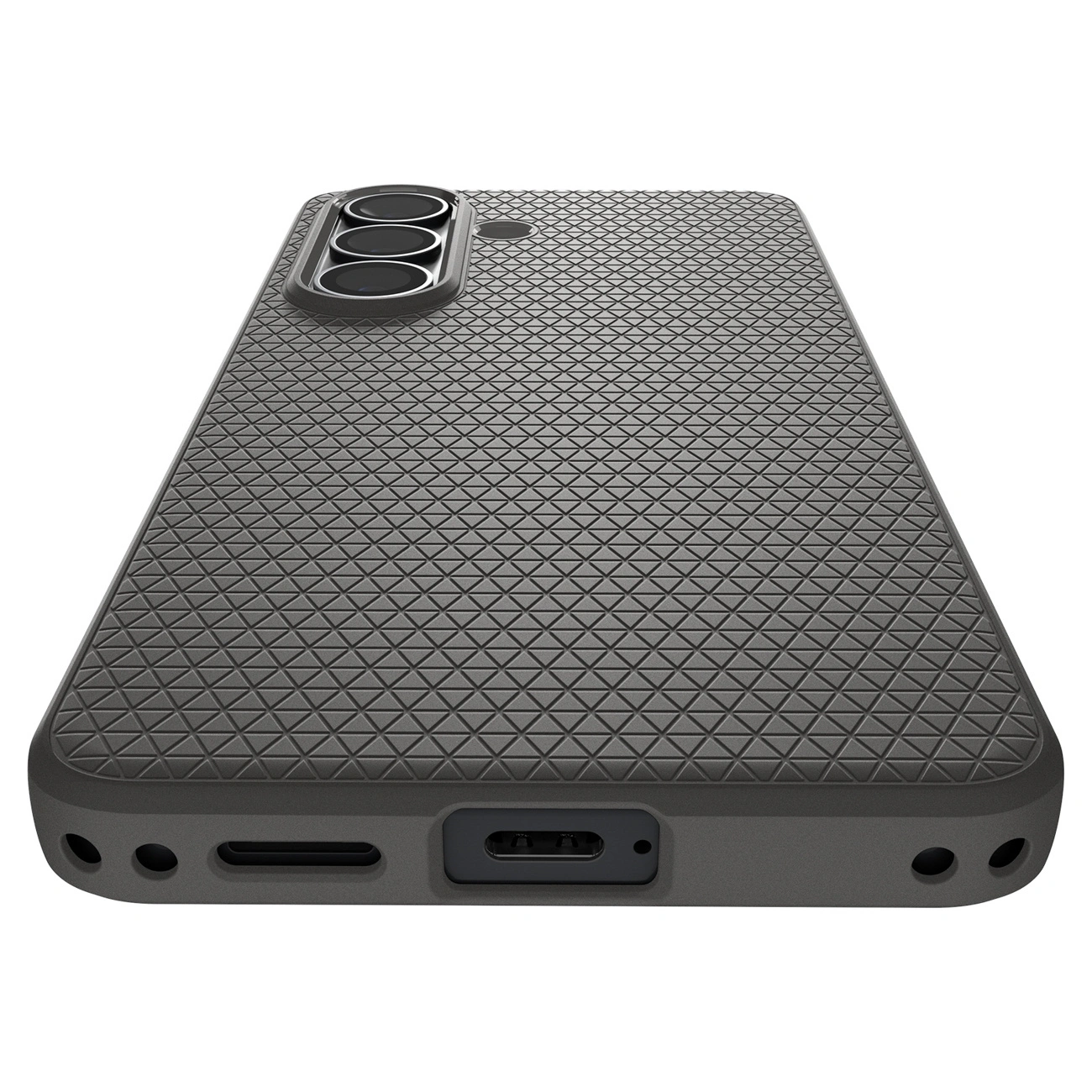 Spigen Liquid Air to smukłe etui wykonane w całości z wytrzymałego TPU, które łączy minimalistyczny design z niezawodną ochroną. Matowa teksturowana powierzchnia zapewnia pewny, antypoślizgowy chwyt i przyjemne dotyku wykończenie, eliminując ryzyko wyślizgnięcia telefonu z dłoni podczas codziennego użytkowania. Charakterystyczny geometryczny wzór nadaje etui nowoczesny wygląd, odróżniając je od standardowych gładkich obudów.
