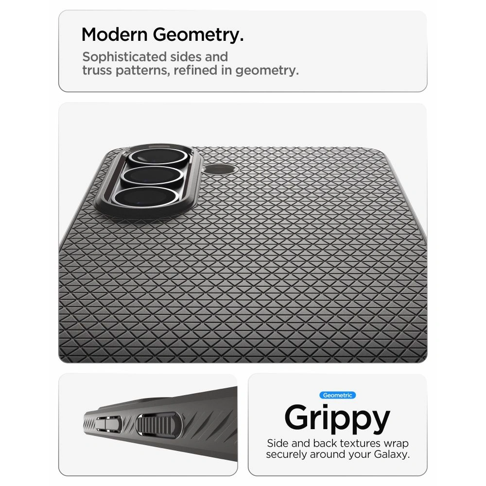 Spigen Liquid Air to smukłe etui wykonane w całości z wytrzymałego TPU, które łączy minimalistyczny design z niezawodną ochroną. Matowa teksturowana powierzchnia zapewnia pewny, antypoślizgowy chwyt i przyjemne dotyku wykończenie, eliminując ryzyko wyślizgnięcia telefonu z dłoni podczas codziennego użytkowania. Charakterystyczny geometryczny wzór nadaje etui nowoczesny wygląd, odróżniając je od standardowych gładkich obudów.