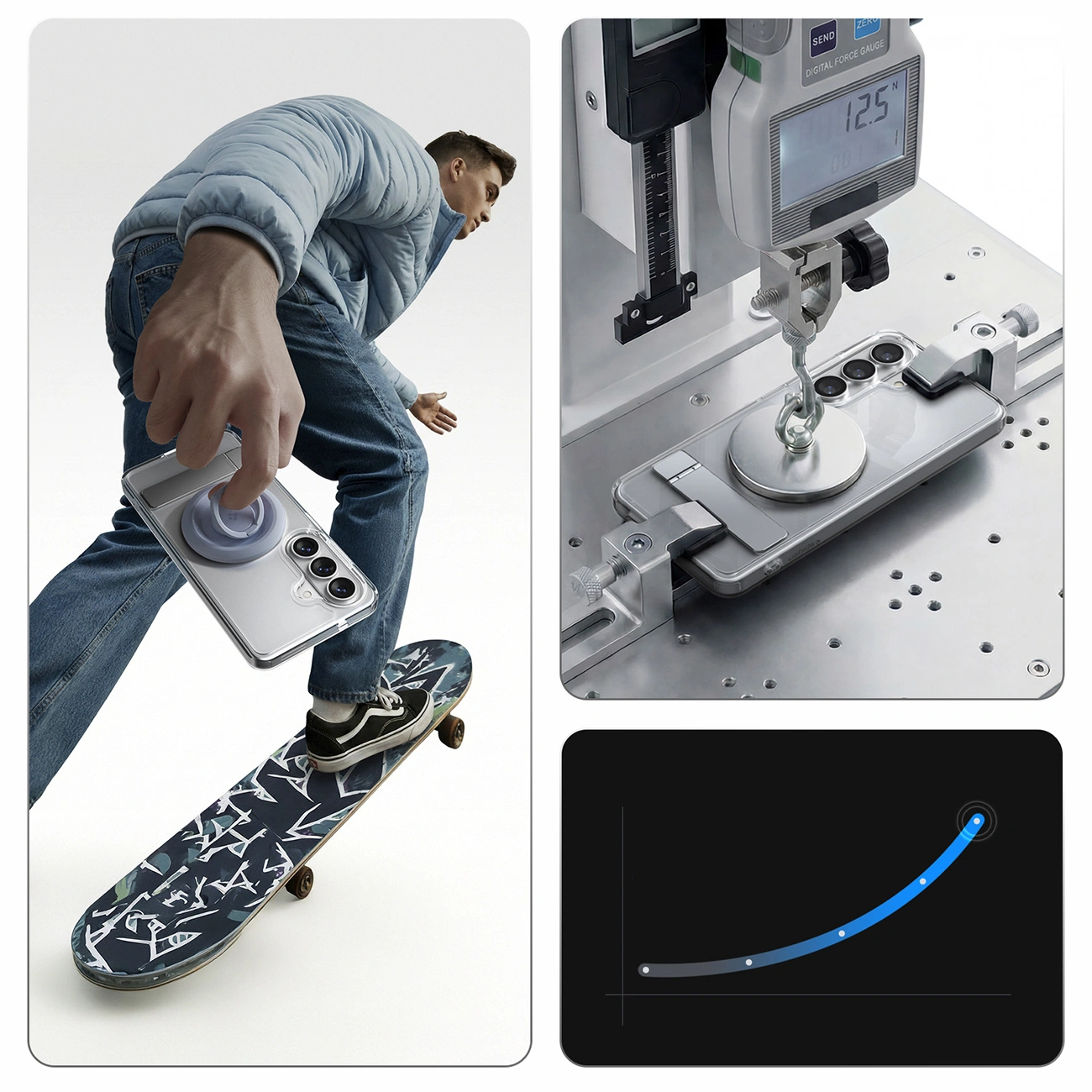 Delikatnie podwyższone krawędzie wokół ekranu i aparatu chronią te elementy przed bezpośrednim kontaktem z powierzchnią płaską, a precyzyjnie wykonane wycięcia umożliwiają łatwy dostęp do wszystkich portów, przycisków i funkcji urządzenia.