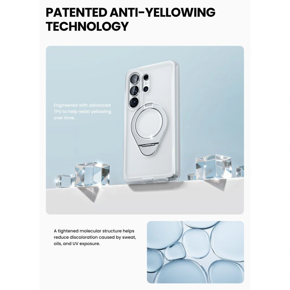 Wbudowany pierścień magnetyczny MagSafe zapewnia pełną kompatybilność z akcesoriami magnetycznymi, w tym ładowarkami bezprzewodowymi, uchwytami samochodowymi i powerbankami. Aluminiowy ring na palec pełni podwójną funkcję - zapewnia pewny chwyt oraz działa jako podstawka w orientacji pionowej i poziomej.